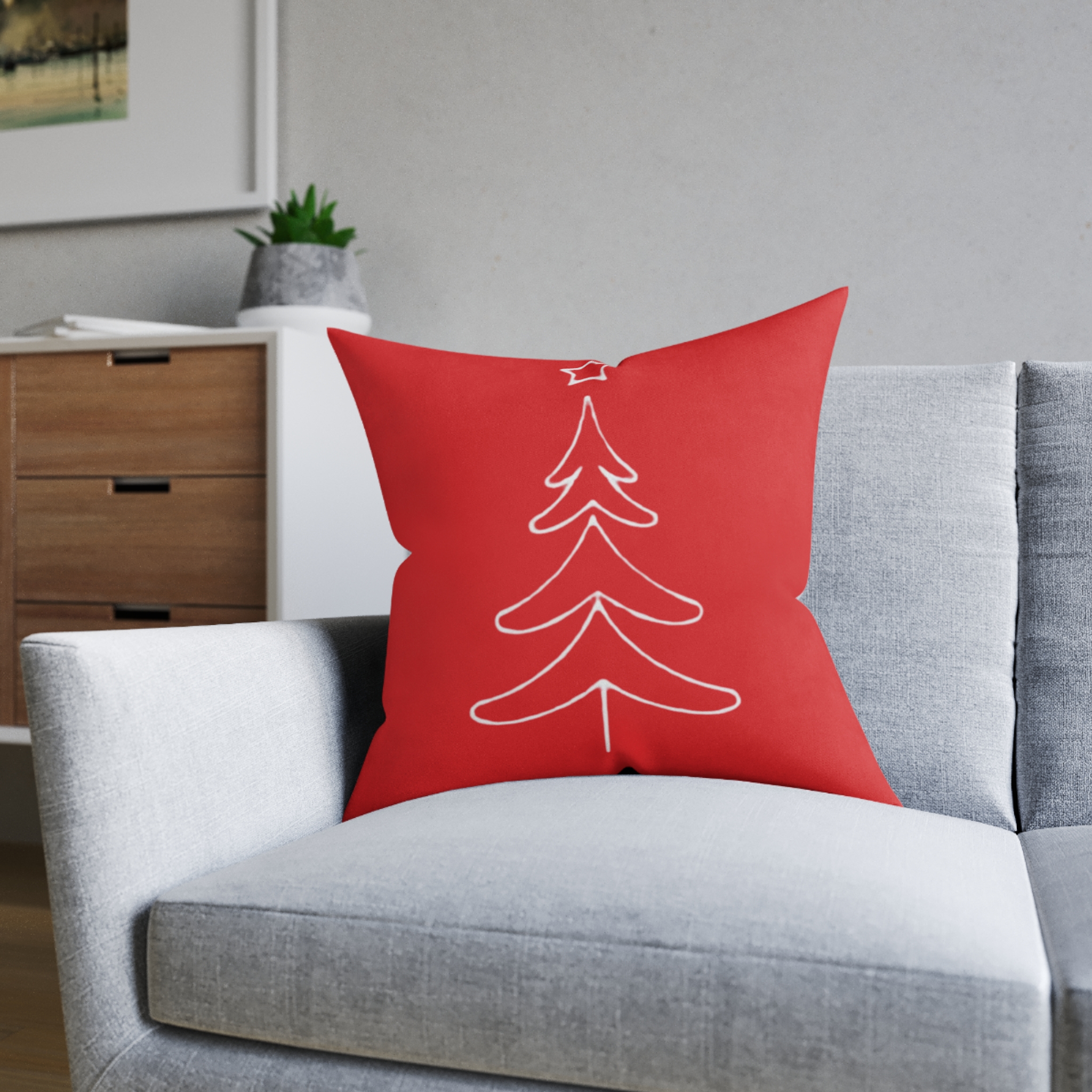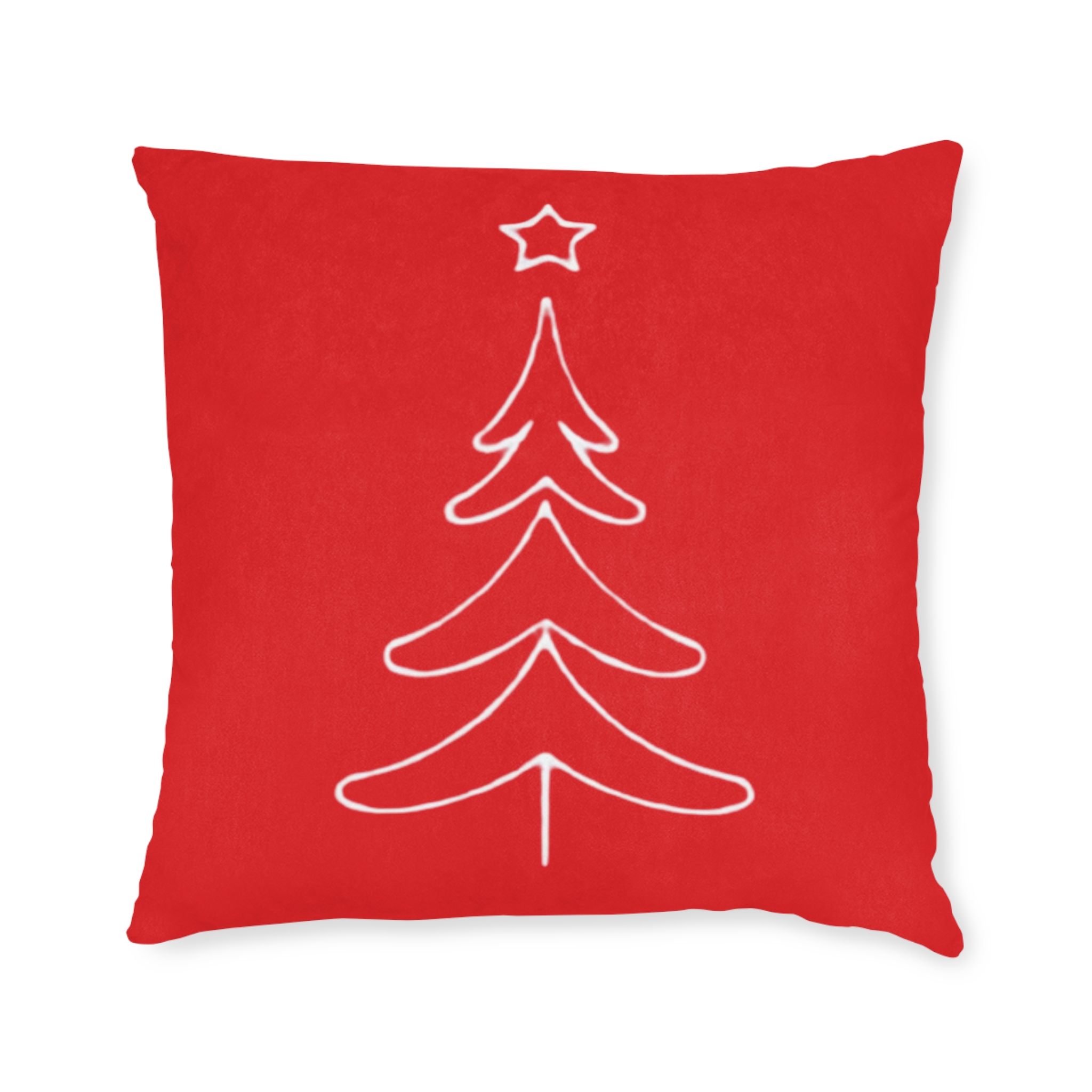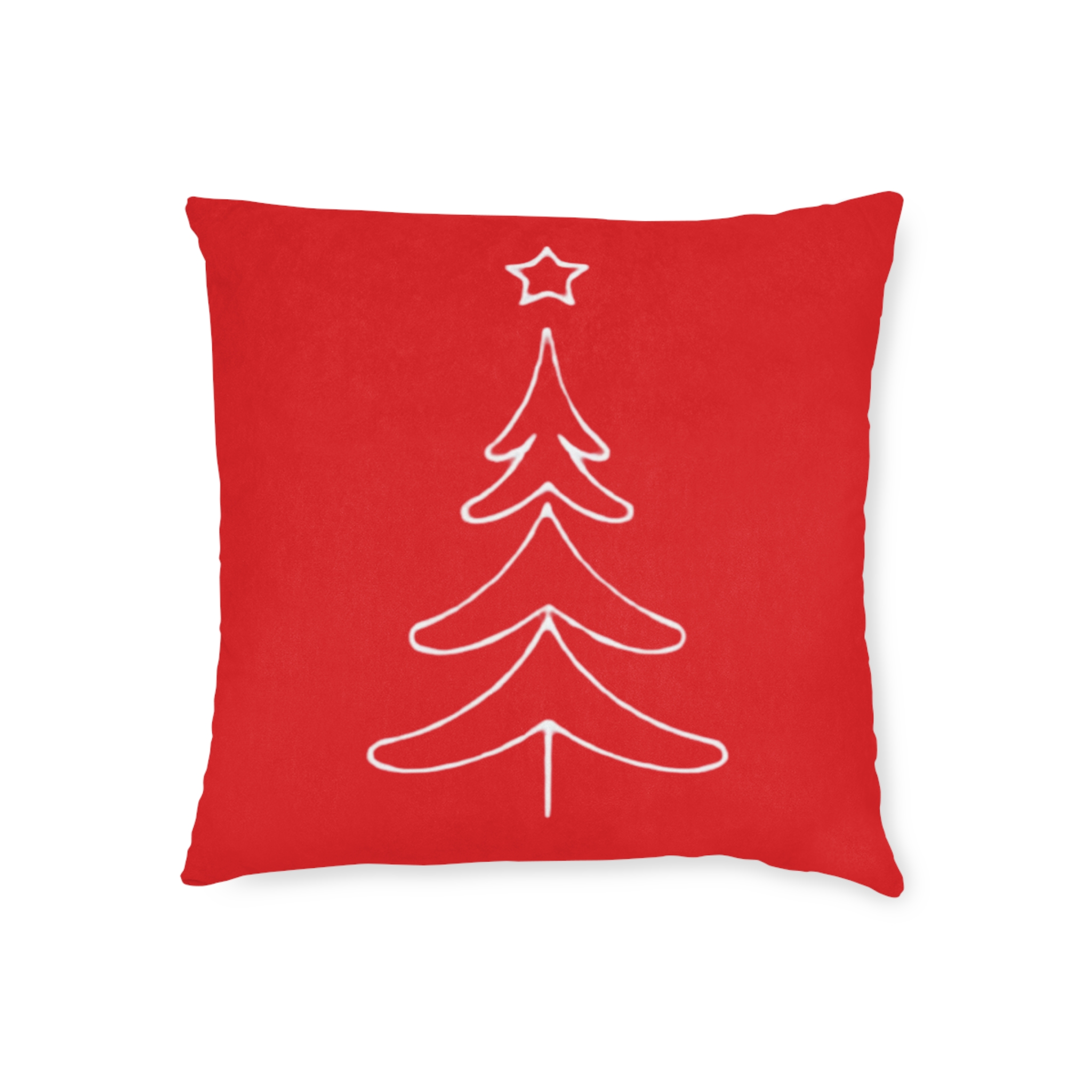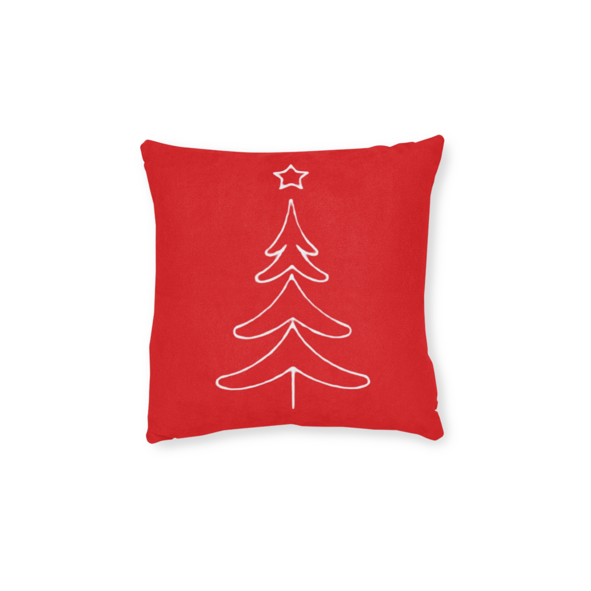 A cozy square pillow that brings a quiet, modern holiday vibe to living rooms and reading nooks. The rich red faux-suede cover features a simple white line-drawn Christmas tree and star, printed on both sides for a clean, balanced look from any angle. Plush filling and a soft-to-the-touch surface invite you to lean in during cold evenings, while the concealed zipper keeps the silhouette tidy. Comes in three sizes to layer on sofas or tuck into a favorite chair — this pillow adds warmth without fuss, creating a subtle focal point for seasonal gatherings and slow winter mornings.