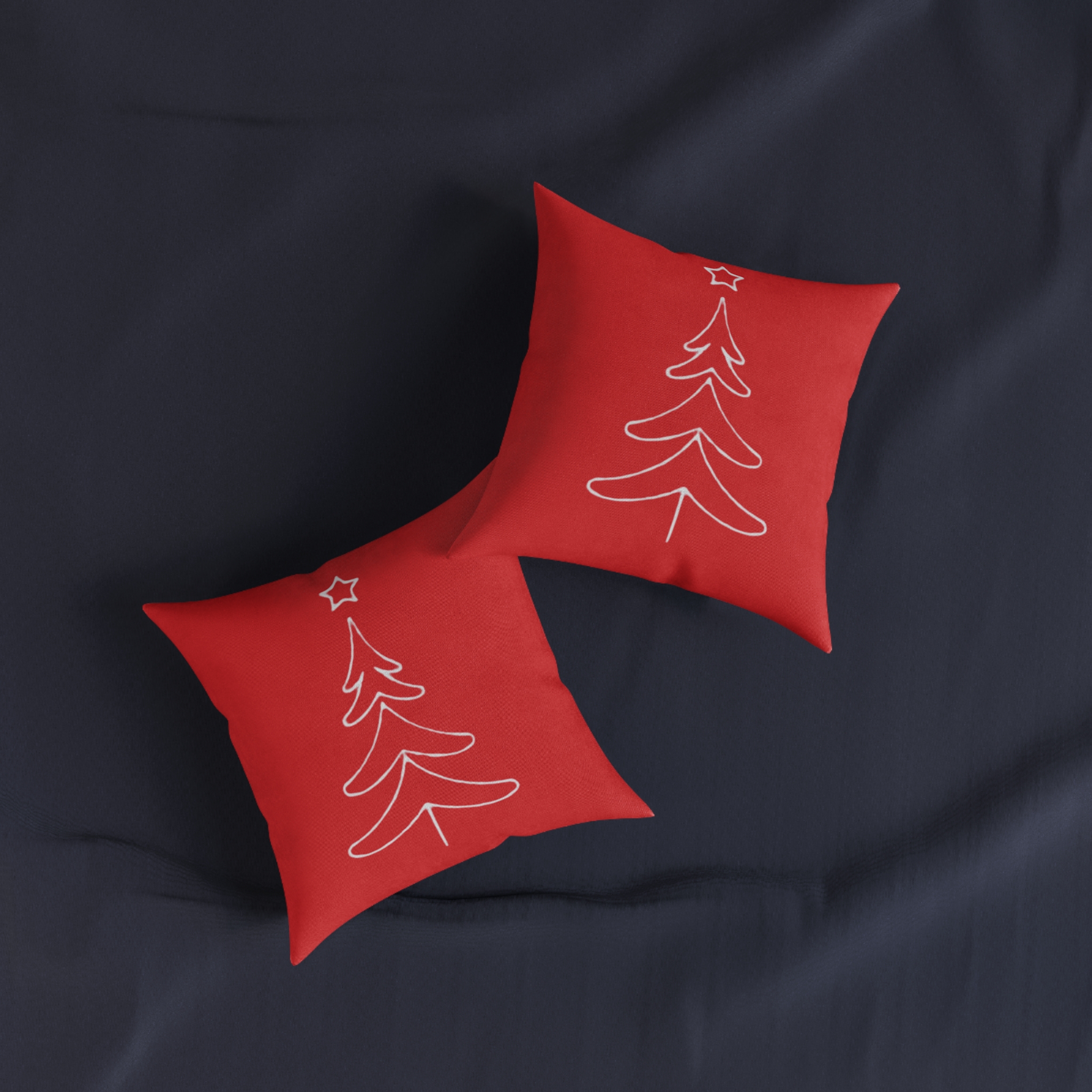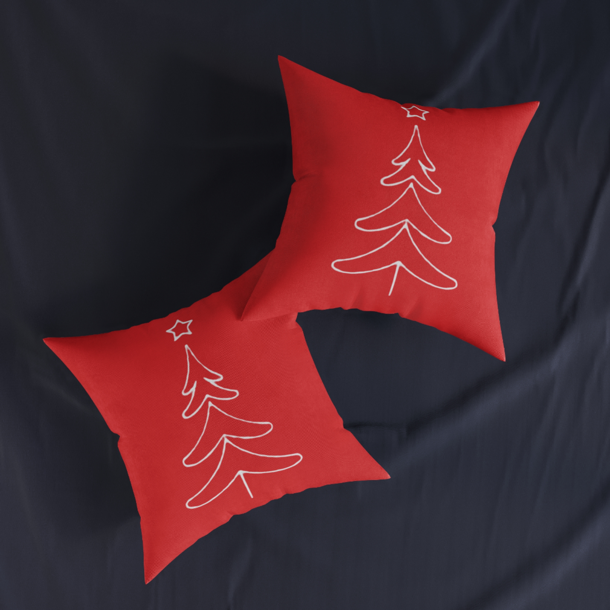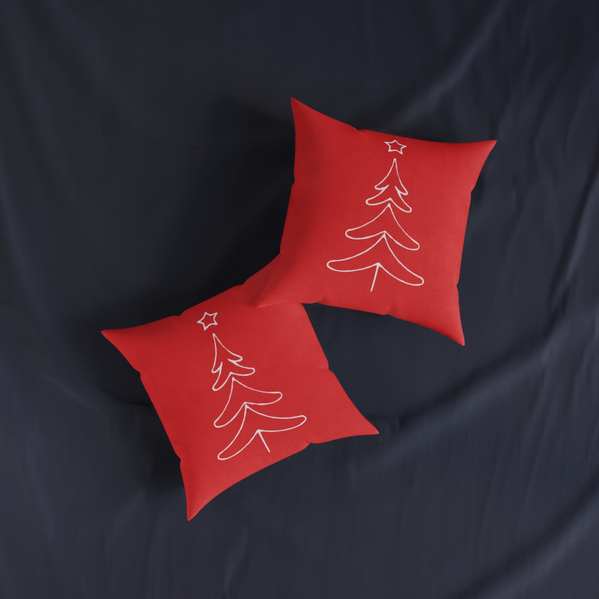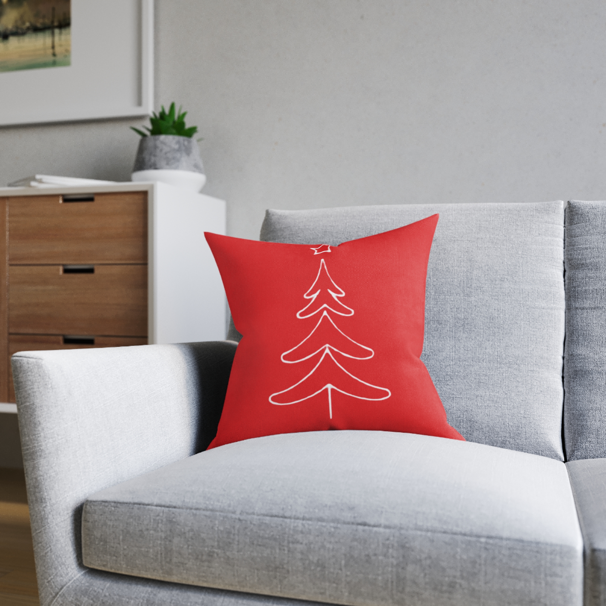 A cozy square pillow that brings a quiet, modern holiday vibe to living rooms and reading nooks. The rich red faux-suede cover features a simple white line-drawn Christmas tree and star, printed on both sides for a clean, balanced look from any angle. Plush filling and a soft-to-the-touch surface invite you to lean in during cold evenings, while the concealed zipper keeps the silhouette tidy. Comes in three sizes to layer on sofas or tuck into a favorite chair — this pillow adds warmth without fuss, creating a subtle focal point for seasonal gatherings and slow winter mornings.
